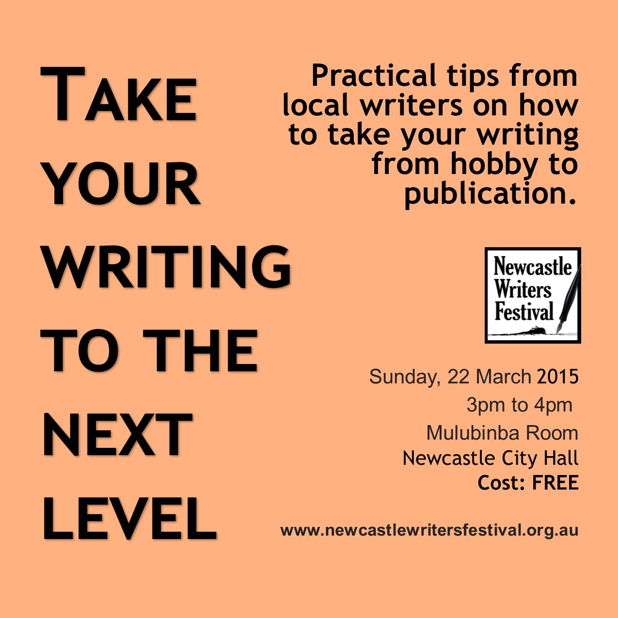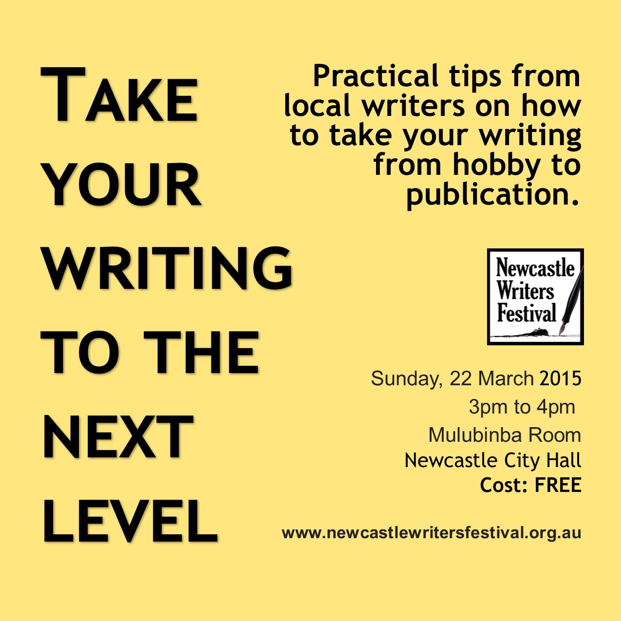 Below is a session summary and key notes from today’s Newcastle Writers Festival session ‘The Next Level: How to take your writing from hobby to publication’. This is a FREE event held today at Newcastle City Hall in the Mulubinba Room at 3pm.